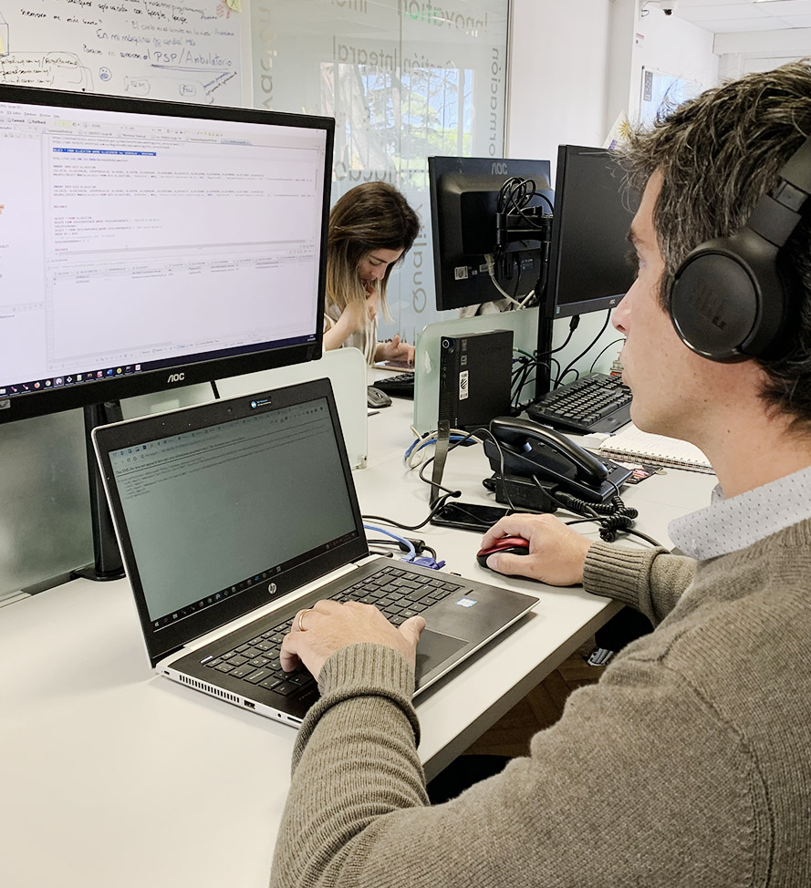 Técnicos expertos en usabilidad, experiencia de usuario (UI/UX), arquitectura, programación, aseguramiento de calidad y expertos en informática médica participan a lo largo de todo el ciclo de vida de desarrollo de software. Considerando la seguridad de información (privacidad , la disponibilidad y la accesibilidad) y el análisis de datos en etapas tempranas del desarrollo logramos productos acorde a los requerimientos contemporáneos de la tecnología aplicada a la eSalud.